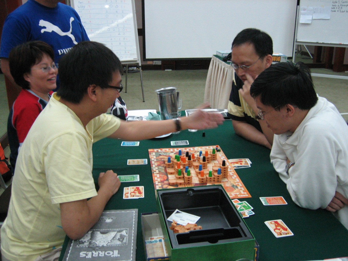 The morning session of Day One (8/10/06) saw us played three rounds of Euro Games; one qualifying round (Heck Meck) and two competitive rounds where the gamers not only score points for their finishing position but also switch tables after each game so that i) they get to mixed around with other gamers, and ii) the gamers with more wins will move up eventually to Table 1.