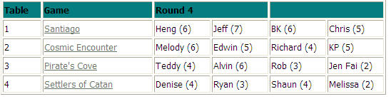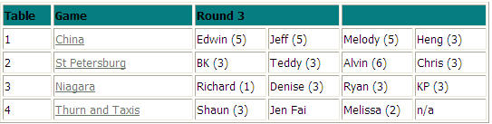 After two rounds of gaming (and lunch), this is where everyone stands and their table positions to start Round 3. You can see the gamers who were leading the pack were grouped into Table 1 while Table 2 hosts gamers with the next most wins. This round was also a little special as it featured not one but two Spiel des Jahres award winner; Niagara in 2005 and Thurn & Taxis the recent winner in 2006.