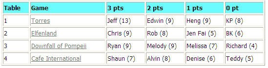 This shall be the last round before we call it a day for Day One, and we have some good 1-hour+ games to bring to the table including two very good gateway games: Downfall of Pompeii and Cafe International. One of Alan Moon’s early games Elfenland was also in play together with the Spiel des Jahres Winner for 2000 – Torres.
