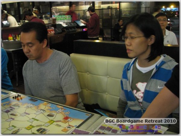 A newbie game of Le Harve. In the end, the day proved too tiring and the gamers retired after playing a few games. Not pictured here is the crack game of Race for the Galaxy played by veterans rob, aanemesis, wolfx and myself.