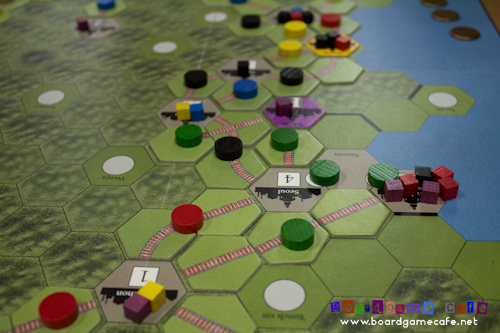 Hiew (another Wallace fan I presume) brought his copy to the OTK table tonight with the Korea map from the official AOS Map Expansion #3. I’d thought I done the Korean map before – but when the rules were explained that all cities in Korea are gray and therefore the demand of cubes are based on the existing cubes in the city rather than being a fixed color (as in vanilla Age of Steam) – I realized I’d not done Korea but probably Scandinavia (which is the other map in Expansion #3).