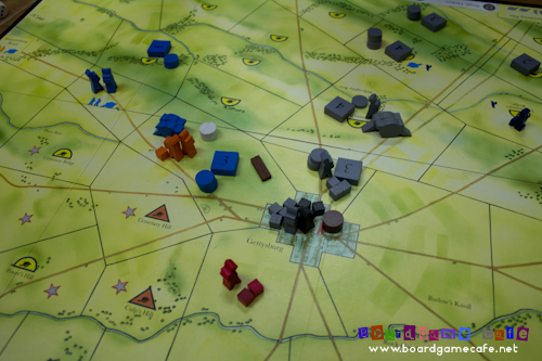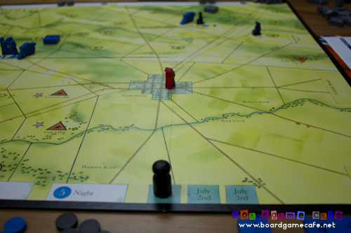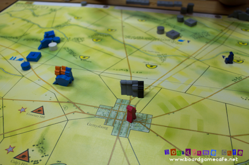 This is the key advantage for the Confederate player in Day One, and clearly the additional order discs should be incentive enough for the Confederate to play more aggressively before Gettysburg becomes harder to take when the Union’s reinforcements arrived later.