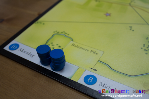 Combined with the higher number of order discs given to the Confederate player, the loss of action tempo due to the black discs can hurt the Union player badly if they did not manage their (blue) orders properly among the four periods – morning, mid-day, afternoon and night – in order to maximize the efficiency of their orders.