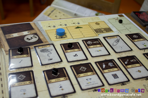 Food is indicated by yellow cubes and the difficulty here is that food is perisable (unless you have built some items such as the Cellar that allows you to store food) so any unused food at the end of the day would be discarded – and you need to get enough food again the following day to make sure everyone on the team can be fed. Not getting enough to feed a team member would cause him to take two wounds (ouch).