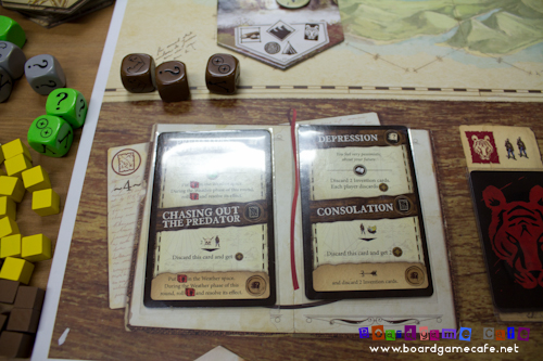 Our game started off well and most of the days proceeded without much incident. We quickly built the Snare which enabled us to get one more food (temporarily solving our feeding problem) and were piling up the wood we gathered into the wood pyre. Everything was looking good and even the occassional threat (from the Threat cards above) like a predator coming into our camp site and having to chase it out did not bothered us too much.