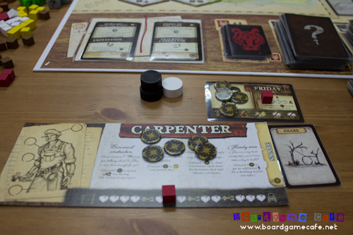 You get to play one of four characters. When I re-read the rules, it seems the Soldier cannot be in play for a 2-player game. No reason given but I suspect one reasons could be his strong ability to hunt which possibly solves your food problem easier. Anyway we’d already decided on the Carpenter (myself) and Explorer (kareem).