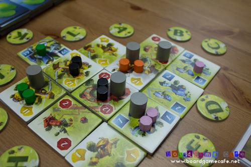 You can also build over someone’s territory… you simply return his resource tokens to him (it goes back to his pool so he can re-use them immediately) plus the bank pays your opponent one VP for each resource token returned. You can put your own resource tokens on to the newly constructed territory. Depending on the level (height) of the constructed territory, you’ll place as many resource tokens on it for eg if you constructed on an existing level-2 tile, you would be improving it to a level-3 tile so you’ll need to place 3 resource tokens onto this new level-3 tile.