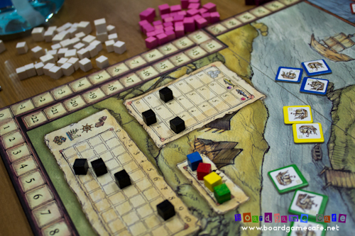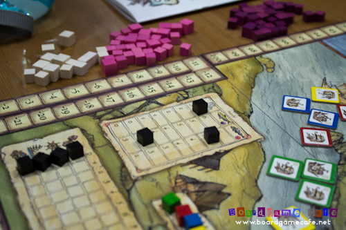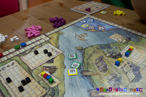 The green cubes above were used to indicate “damage” sections of the ship (usually by pirates or stormy seas) which reduced your ship’s capacity. They can be repaired but would require you to invest in the Lighthouse building (which allows its owner to repair one ship per turn at no additional cost).