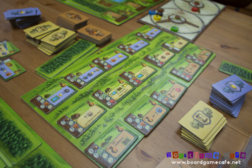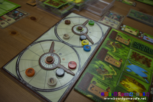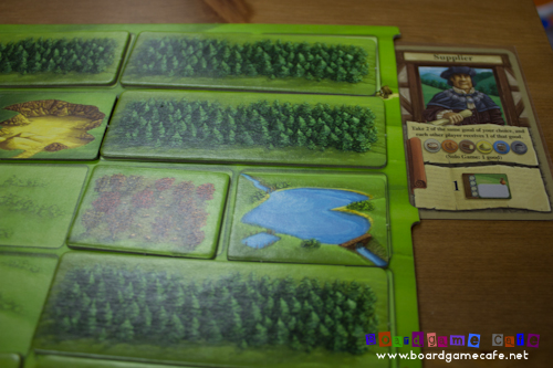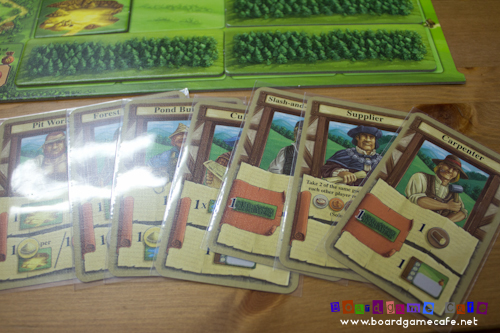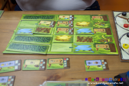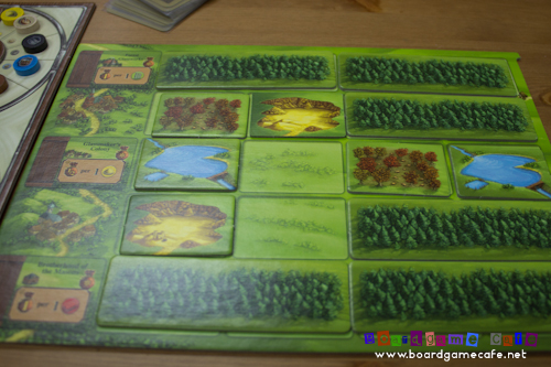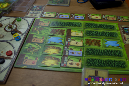 The Agricola factor is immediately felt with your player board (below) being set up similar to a farm land with forest, ponds and groves. You are given only two empty space to build new buildings but the forest can be cleared with certain specialists to produce wood (mostly) and/or other resources like food / charcoal.