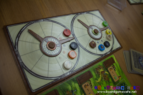 Ah.. The production wheels (Glass & Brick). In a typical game where basic resources can be mixed to produce “finished” resources eg sand/food/charcoal/water/wood to produce one glass (as finished product), you usually get almost full control over when you wish to trigger the production (either by playing an action card, taking an action space or simply paying the basic goods and receiving a finished good.