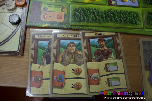Eg above in one particular round, I got to play the Charcoal Burner (burns wood into charcoal), Clay Worker (uses water to make clay) and Builder (which allows me to build 1-2 buildings). That’s a typical 3-action round for a player. If there’s at least one other player who also selected these three cards (Charcoal Burner, Clay Worker or Builder) in their hands for this round, I’ll only get to perform a single action from the card otherwise I get to do both actions.