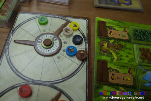Let’s look at Glass, which is produced by the top wheel. Glass is the green token on the left side of the wheel and in the picture above, it said I’ve one unit of Glass. The Glass production wheel only moves when there’s an empty space to the right to the top dial (the one with a small green arrow on its arm). This means you won’t get any glass production – nor can force any glass production on-demand – unless you first produce some sand (yellow token) and food (beige token).