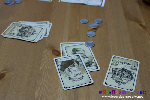 While I like the French graphic (above) of COMPLOT, I think the colorful IndieBoard graphic (below) is more practical as it allows you to easily see the role of a face-up card across the table.