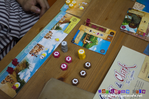 While Dith (yellow) was furiously gathering resources, trading them up for better resources and setting his expedition up for the final – and single – push into Fort Clatsop, his opponents (in particular Boon Khim – Brown) were making quick headways into their expedition.