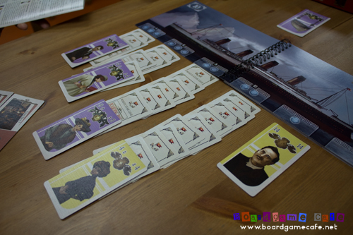 At start of the game – ie when the Titanic has just hit the iceberg – four stacks of passengers are arranged along each deck (there are altogether 6 decks) with only the last passenger card opened face-up.