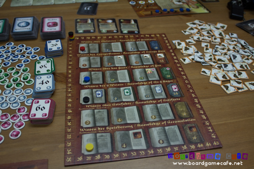 Besides providing customized abilities for your character as you advance the levels of each knowledge area, reaching the zenith ie the 4th level (eg yellow above) also scores you 2 VP. There’s a total of a good 12 VPs available from the 6 knowledge trees.