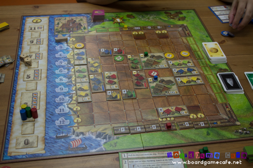 Elasund plays 4 and in the game, you are working together to build the premier city of Catan. You buy building permits – sometimes forcefully “borrowing” permits from another player in order to build a larger buildings – and erect newer and better buildings to improve Elasund with the ultimate aim in building the Church.