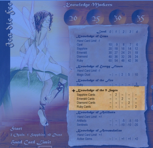 Dith’s character (green) was the Fairy and she has the knowledge of the 9 Sages, which provides good income infusion with 2 extra gem cards (increasingly expensive from Sapphire to Emerald, Diamonds and even Rubies) as he advance that knowledge tree.