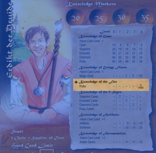 Ivan’s character (yellow) was the hermit (?) and he started with the Knowledge of Accumulation which enables him to have a larger active gem pool (players start with 5 and this knowledge tree allows you to get an additional 2).