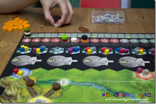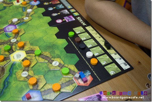 Unlike in AoS where shares once issued stayed unpaid until end of game therefore earlier issuance of shares has a higher residual cost – not to mention getting you closer to the cap of 15 shares after which you can’t raise any more capital. In AoS, if you get caught on the wrong side of a bidding war, you’ll go under in no time. Here in Steam, you’ll likely want to be more aggressive in the bidding since the top three action tiles – Locomotive, Urbanization and City Growth – are pretty powerful especially when taken early.