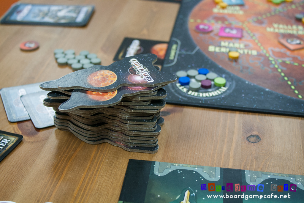 Each of the ten zones in Mars provides one of three resources – ice being the cheapest at 1 VP and eranium the most expensive at 3 VP. The player who has majority control of a zone would get to claim majority bonus VP (tokens) at round 5, round 8 and round 10 (this is a 10-round game).