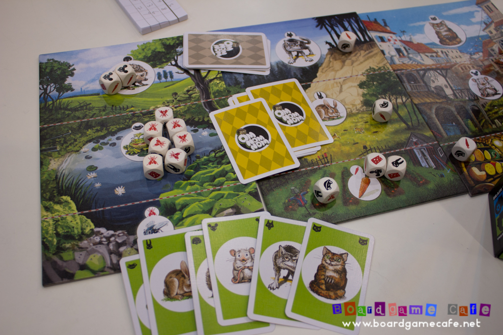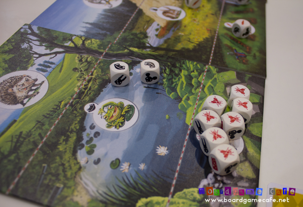 The aim is to play a “higher” predator card to eat (nom nom) the lower predators including the dice. If more than one players have played the “higher” predator cards, they divide the catch.