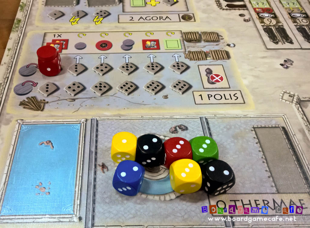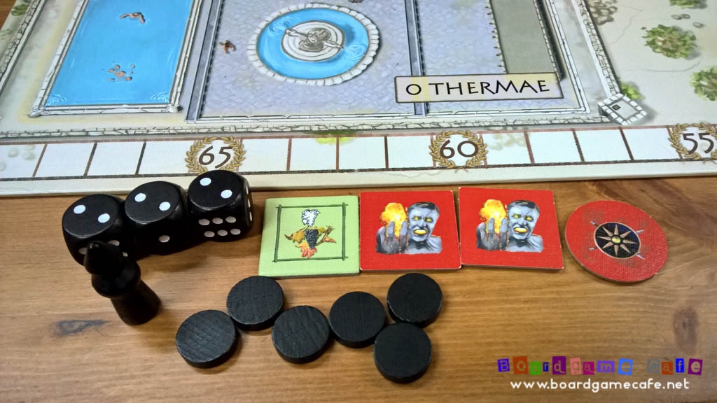The “rest one round” mechanics of the THERMAE also meant you should not – unless it’s to your huge advantage – commit all three of your worker dice in one round. If you do that, you’ll have only your Leader to use as a worker dice in the next round.