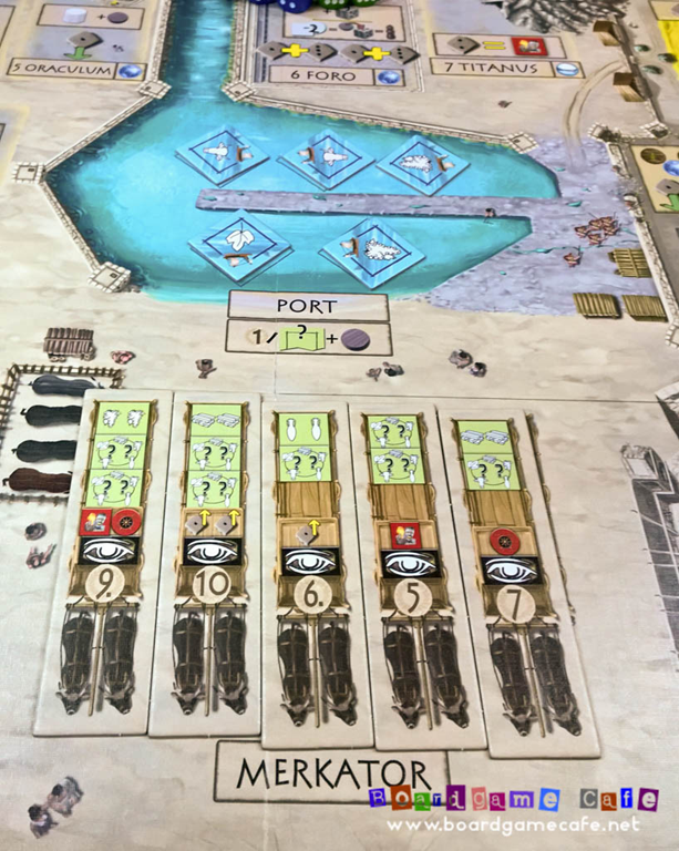 Bearing in mind you have limited worker actions each round, one needs to weight the gains vs lost momentum by visting AGORA-ART-MERKATOR too frequently. The contracts in MERKATOR do pay out good VPs (above: the left most MERKATOR contracts pay out 9VP and 10VP in addition to other benefits) so that might yet be your path to victory.