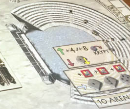 What’s the ARENA? It’s the last worker placement resolution area; and one where if you place a worker here you can challenge any other player to a fight in the Arena. Instead of sending in gladiators, you send in Titans. The winner gets to pocket 4 or 8 VP (the 8 VP gain would require a disc sacrifice into the KRYPT, further hastening the game to a premature end) and the loser downgrades one of his worker dice (to one value lower).