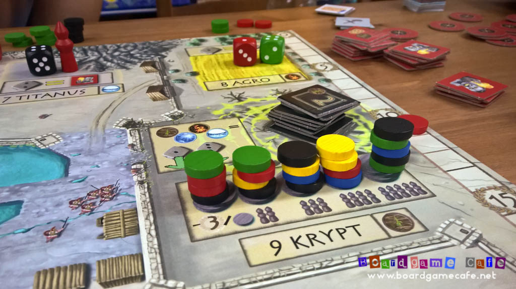 We did a 5-player game and I would think a 4- or 5-player count is the best since this game thrives on confrontation; whether it’s with the Underworld Titans or with the other players especially in the Arena. We all think that’s how Bernd intended for this game to be played; and not as a pure goods trading game (which explained the skewed direction the game in Essen took). An aggressive approach via Titans – and obviously you also need to win the fights you are getting into – would always be an advantage as it’s easy to rush the game to a premature end via the KRYPT playing to the aggressor’s advantage.