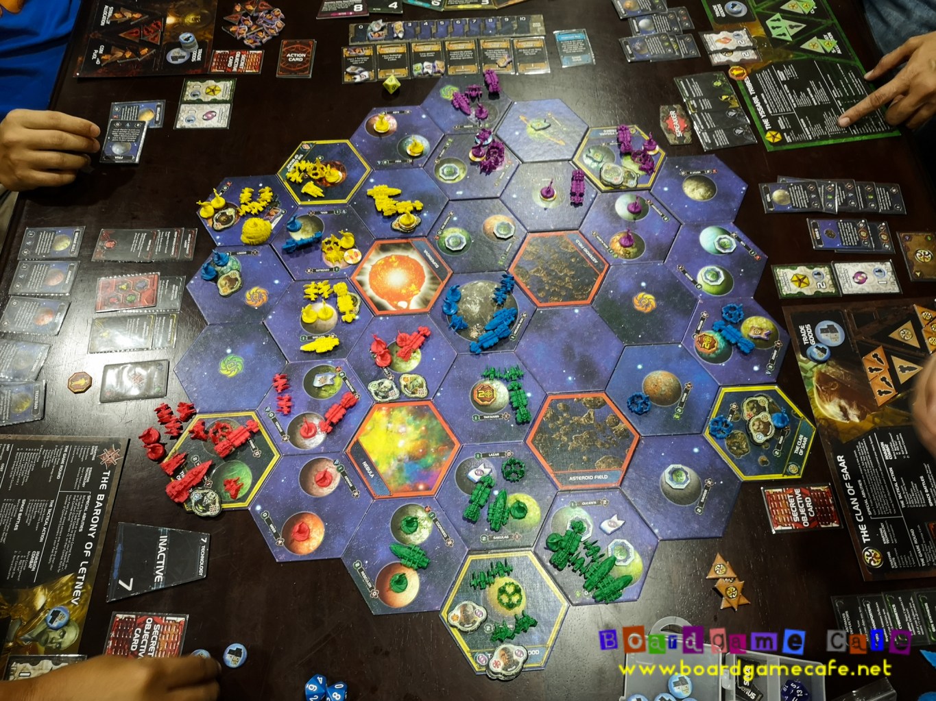 We broke for lunch around 1pm. SAAR (blue) in Mecatol, YIN (green) stalled sikit kat at Tar Mann but also distracted with the east incursion (that’s supposedly for some public objectives).