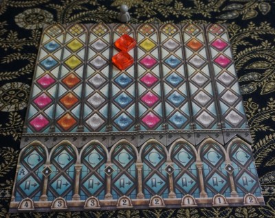 Despite sharing the same tile claiming mechanism, Stained Glass of Sintra feels rather different from its siblings because of how the player boards work. Every time you complete a window, all windows to its right score again. To maximise this, you would complete the rightmost window first, then gradually work leftwards. However to do this means you need to choose to reset your pawn frequently. Resetting your pawn costs you one precious turn. This is a dilemma.