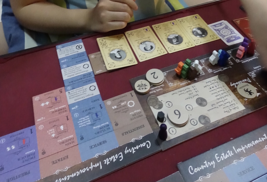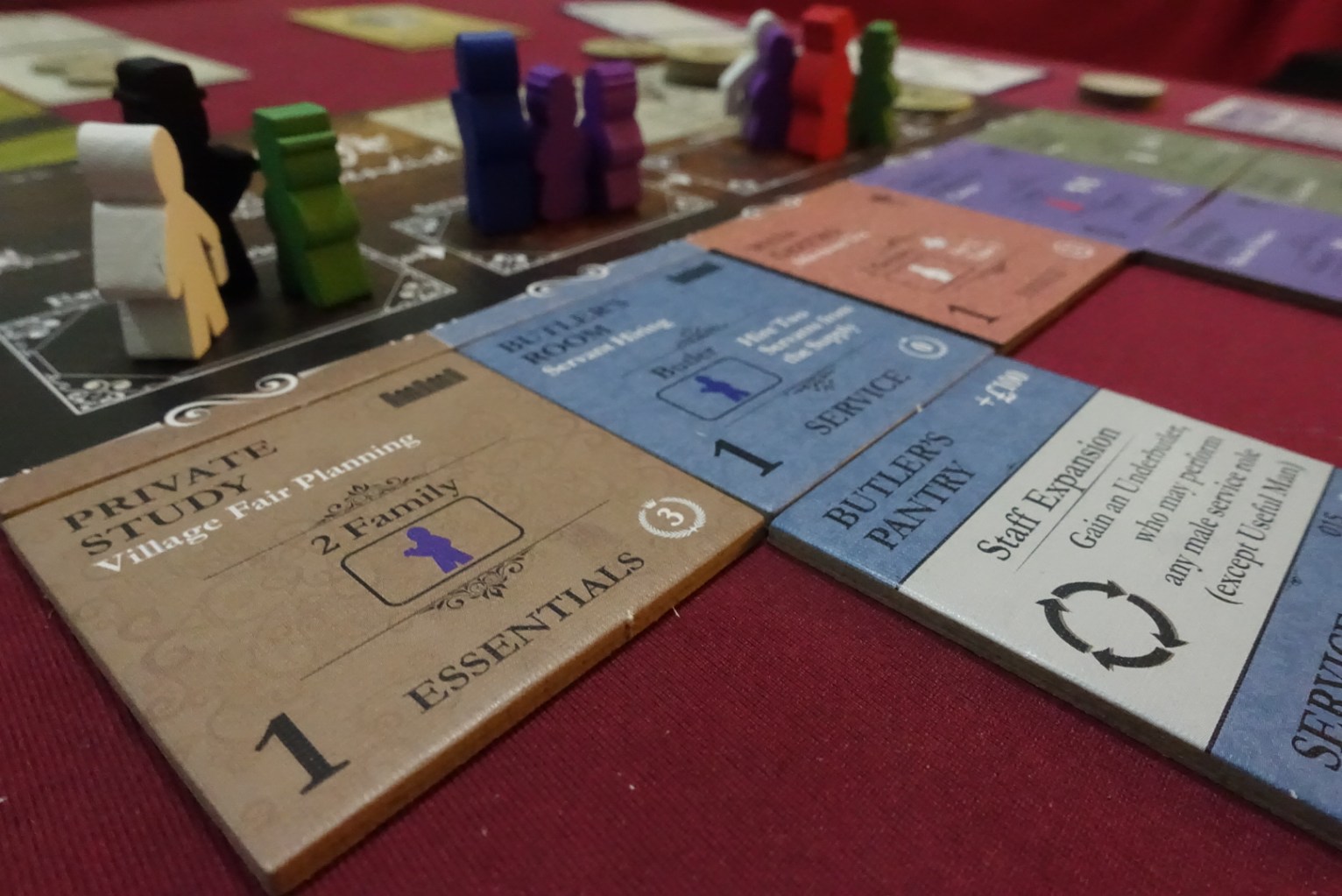 You begin the game with five staff: Butler, Housemistress, Valet, Lady’s Maid, and Footman. Events you host and guests you invite often require some combination of service and attention. The five servants you begin with are hardly enough and – unless you make some time to hire more servants – your life could soon turn into a living logistical nightmare as you attempt to host more grandiose events. In each of our games, we often finished with 10 or more servants on staff, and since each one is worth 2VP in endgame scoring that’s not a bad thing by any means.