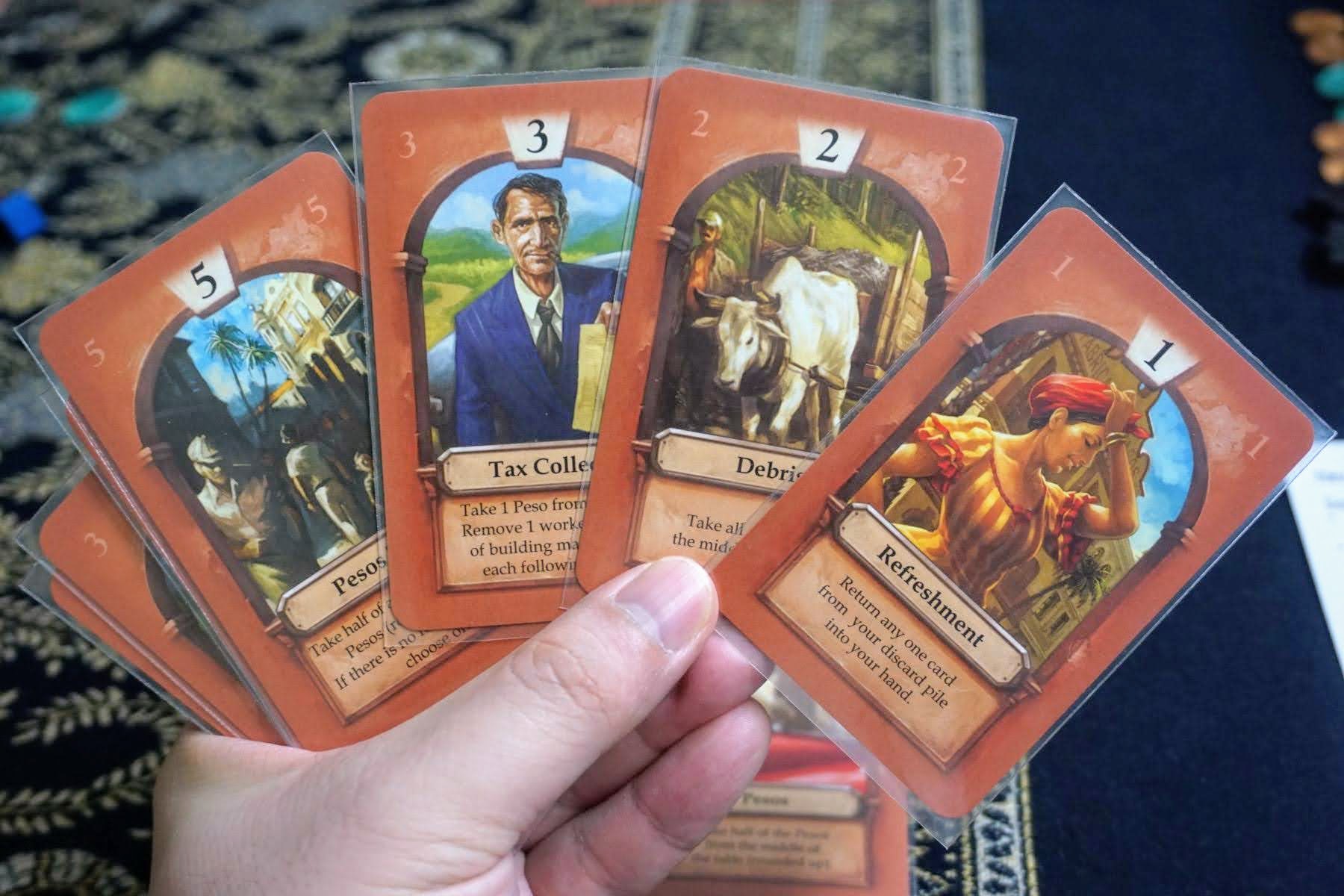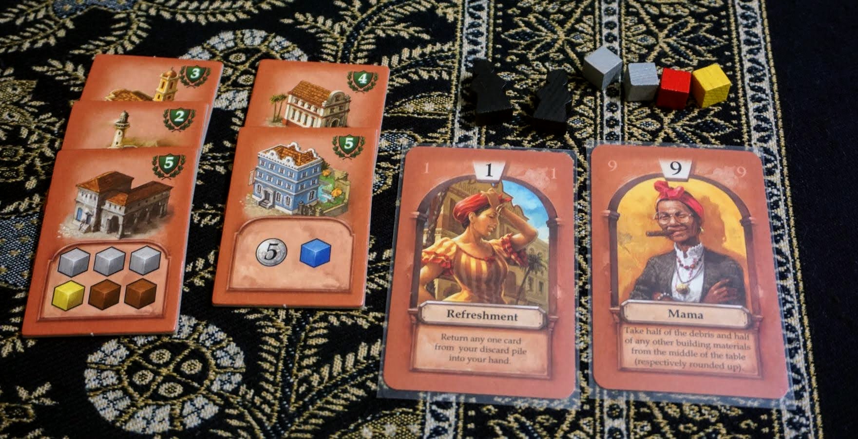 Havana is a game with some aggression. The most interesting core of the game is how you select your actions to both utilise them well and manipulate turn order. Turn order certainly is important. You don’t want to have your resources robbed just before you are going to construct that high-valued building. The race for constructing the same building can be intense. If someone else constructs the building you have been working towards, the resources you have accumulated may not be useful for other buildings. There is some psychology in this game because you need to guess what kind of cards your opponents are picking. Are they going to attack? Or will they rush to build? How far will they compromise between turn order and action effectiveness?