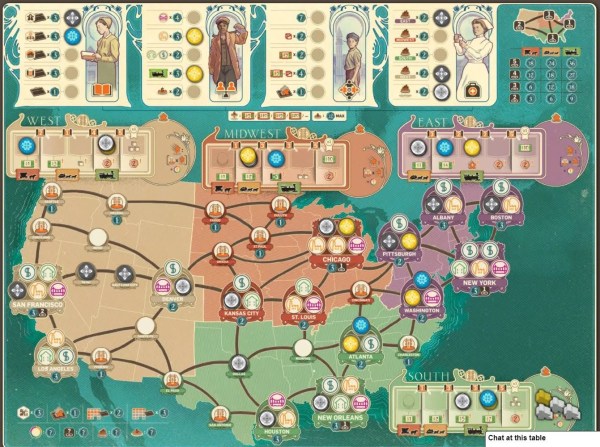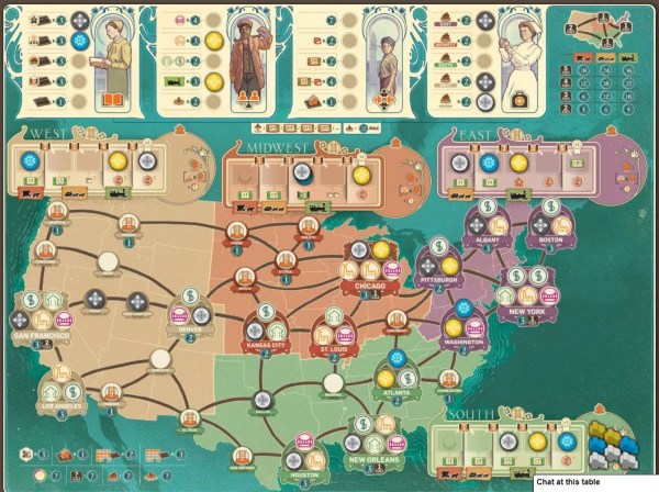 The board is divided into four region – East, South, Mid-West and West. No, there is no North. That would be Canada. There are cities and towns of different sizes, with between one to five circular slots for projects. The slots in the medium and large cities specify what project type they allow. The slots in the small towns can be used for any project type. Some cities show a blue heptagon (7-sided polygon). Projects built at these cities score victory points (VP) as indicated in the heptagons.