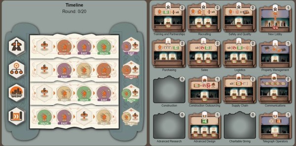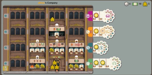 Actions you get to perform are all related to the four types of departments you have. HR type departments move workers about, assigning them to departments. New workers and workers returning from outstation work assemble at the lobby. You need to use your HR ability to move them to specific departments so that they can do work again. For some departments, you must also spend money to train your workers before they can start working. At some departments, activating a worker will send him to the board, i.e. he’s taking an outstation assignment. Such a worker may later return to HQ, and make some profit for the company when he does so. Once he’s back, he’ll be sitting in the lobby waiting to be assigned again. He may need to be trained again, even if he is assigned to a department he has worked in before.