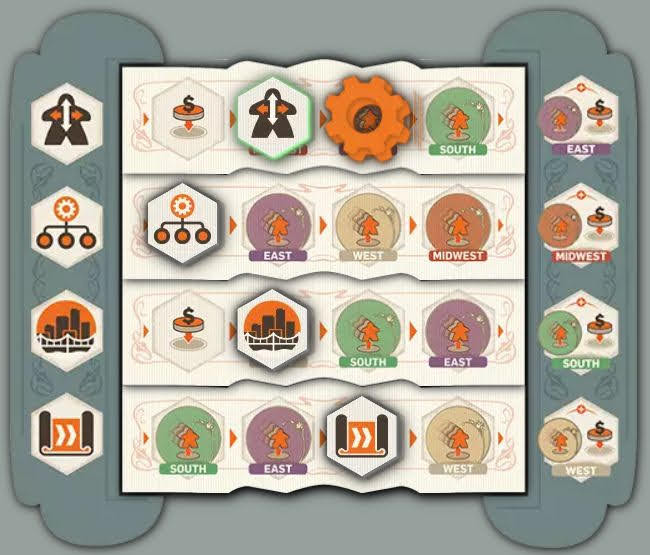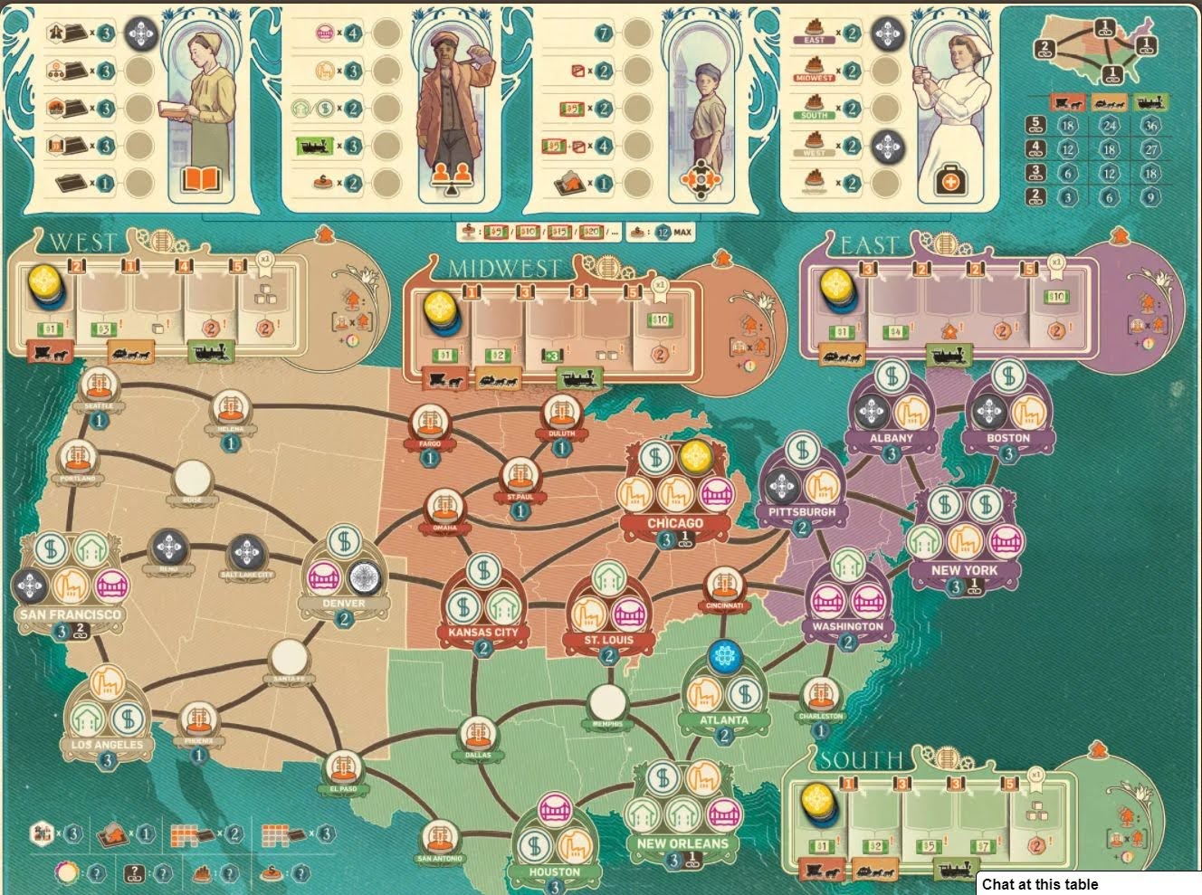 This is the scoring table for your transportation network. Let’s use an example to explain this. If you are able to connect Chicago (Mid West), New York (East) and New Orleans (South), your total link value will be 3. If your lowest transportation level in these three regions is the second level (yellow), you will score 12 points.