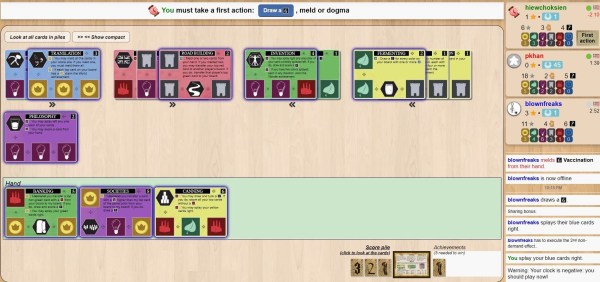 None of us were newbies at Innovation, but we all struggled when we played online. It wasn’t because we were rusty. It was because online play was too quick. Most of the card abilities were executed by the computer automatically. Cards flew across the screen. We could not keep up. Our actions were presented conveniently as buttons or cards to click. We instinctively followed the visual cues to click, and didn’t spend enough time to study our cards or the game situation. We became overwhelmed. There can be such a thing as being so good that it ends up being bad. This was not the fault of the system. It was entirely our fault. In our second game, we deliberately slowed down to ponder our cards and our opponents’ cards. Only then we managed to catch our breath and think clearly. We shouldn’t have let convenience lead us into hurried and sloppy play.
