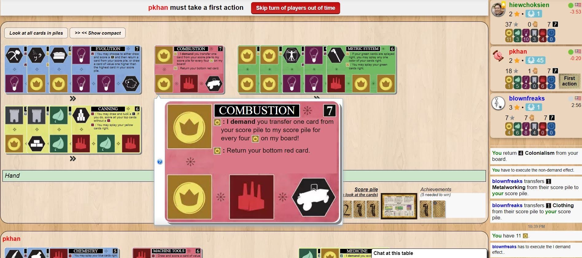 You can enlarge any card to read the details like this Combustion card above. In this screenshot, the blue, green and yellow cards in my play area are already stacked (i.e. have more than one card played) and they are also splayed (i.e. spread out to reveal some of the icons of the cards beneath). You can view those non-top cards. Sometimes you need to, but not frequently. Yes, this game is quite daunting for new players because of so many cards to read. Stick with it. It’s a crazy fun game!