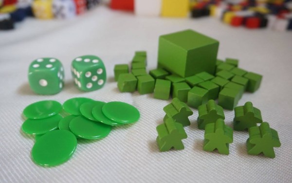 Inside the box you have big and small wooden cubes, plastic dice, wooden Carcassonne-style meeples, and plastic coins. Some additional zip-lock bags are provided too.