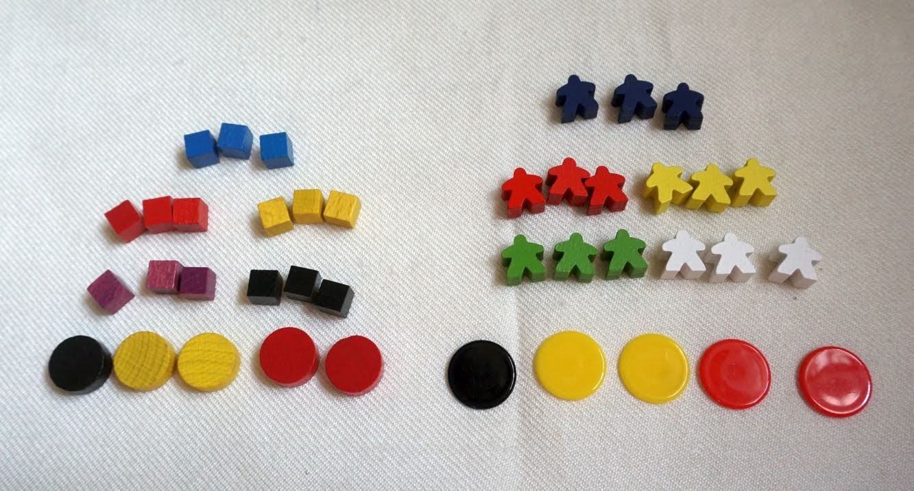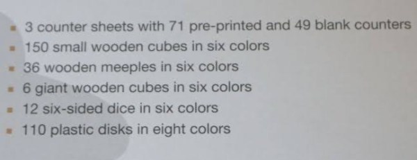 Upon opening the box you will find three punch boards, two of which are printed with different colours and icons, and the last one being blank. There are round, square and hexagonal counters. The coloured tokens are in 5 of the 6 player colours. Most other components come in 6 colours. I guess if you need tokens for the white player, you can use round tokens from the blank punch board.