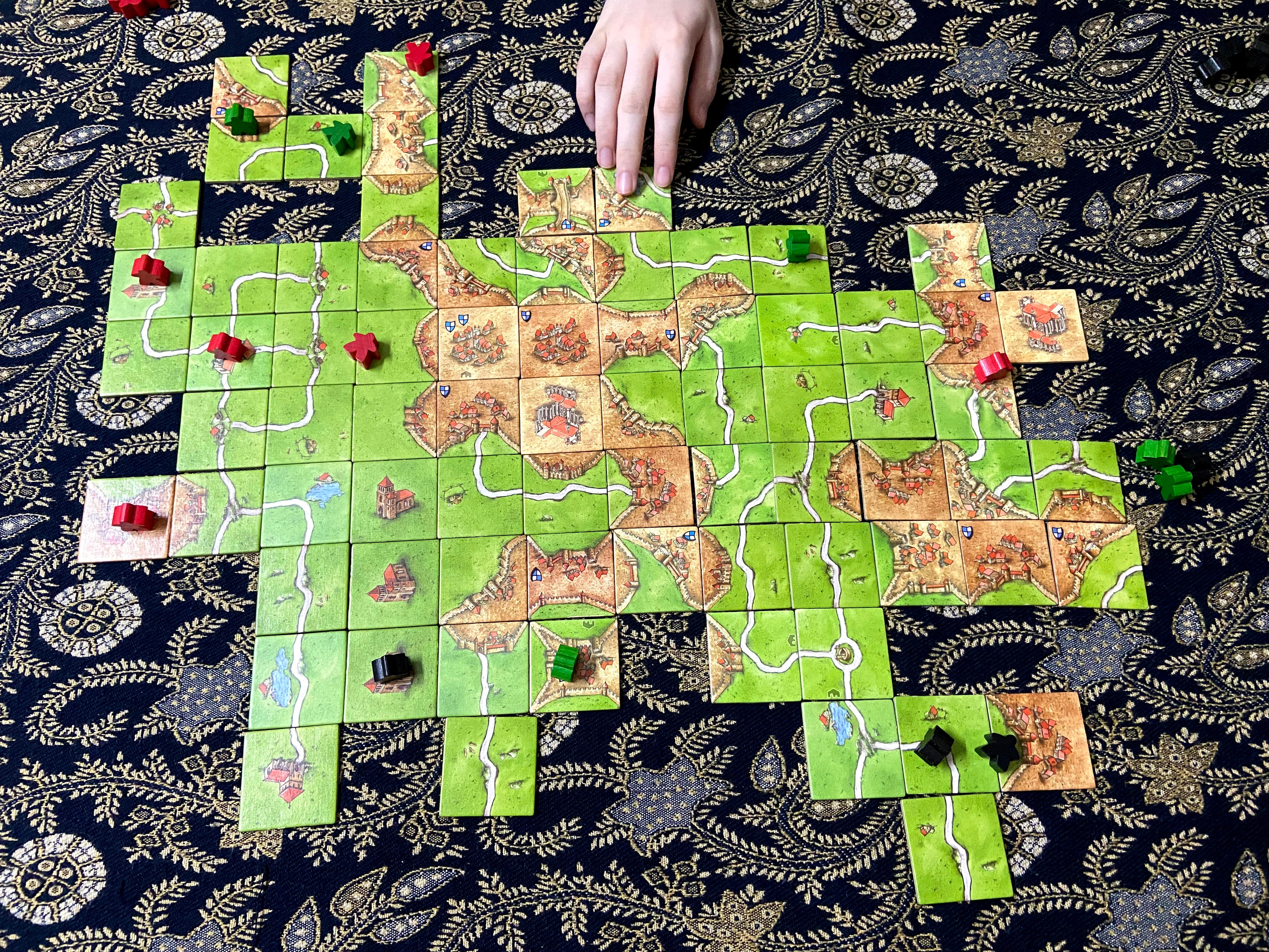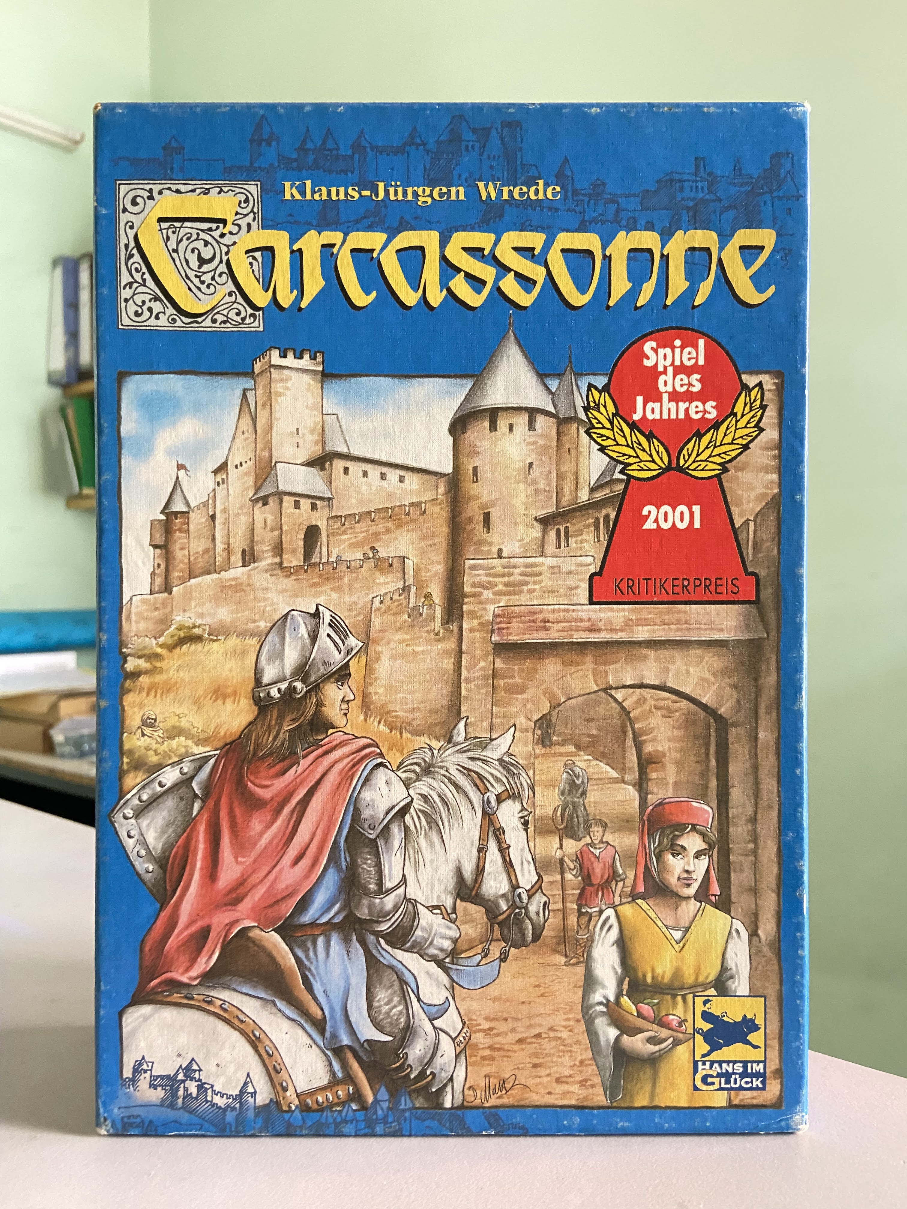 3 Oct 2021. I brought out Carcassonne again. The previous play was Sep 2019. I had thought it was much longer ago than that. Carcassonne by now has reached classic status. Published in 2000, it won both the 2001 Spiel des Jahres and Deutscher Spiele Preis. It is not as popular now compared to its heyday. In the 00’s, it was almost like a mandatory game for new gamers. Now it is no longer surprising for newer gamers to have not tried it. Carcassonne has a special place in my heart because it was among a handful of games I played a lot of when I got into the hobby. My copy is the first edition. The current edition has different artwork for both the box cover and the tiles.