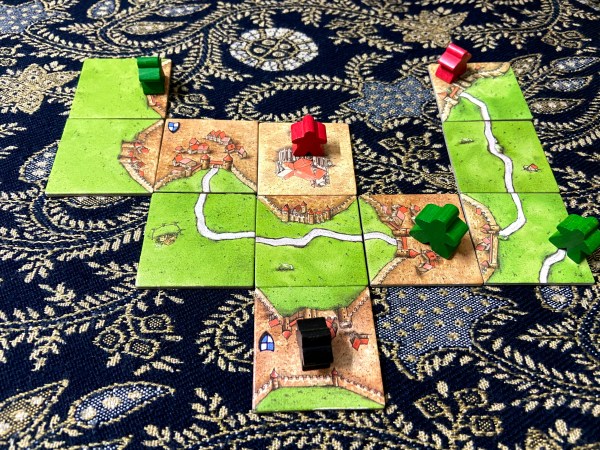 My Carcassonne is quite the Frankenstein, containing many expansions. I have the first expansion, which is almost essential. I call this the fat boy expansion because it comes with the big meeple. The official name is Inns & Cathedrals. I also have Abbey & Mayor. In this particular game, I used the tiles but not the various meeples that come with Abbey & Mayor. I have quite a few mini expansions, most of which came with the Spielbox magazine. I don’t even remember their names. Since we have many more tiles than the base game, our games go a little longer.