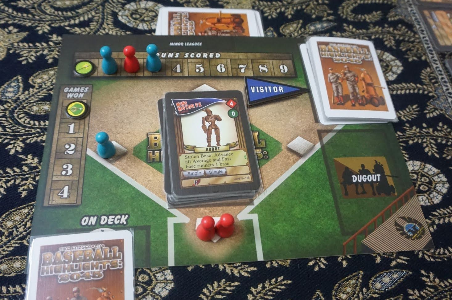 I bought a used copy of Baseball Highlights 2045. I rarely play sports-themed games and generally don’t find them interesting. I am not familiar with baseball. However I quite enjoyed this game. It’s a tactical 2-player game with some deck-building. You gradually trade mediocre players for better and better ones, augmenting your team. You will leverage the abilities of your players. At the same time you watch what kind of players your opponent is buying, so that you know how to play against them, maybe even recruit new players who are good at defending against or even neutralising your opponent’s strengths.