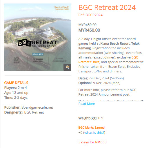 MAIN PROGRAMME (2-day weekend). Regular fee per person is RM450 which covers all meals (except dinners), twin-sharing accommodation, our exclusive BGC Retreat t-shirt, and a special commemorative finisher “token” direct from Essen Spiel! Getting yourself to/from the venue would be at your own cost and we recommend car-pool if possible.